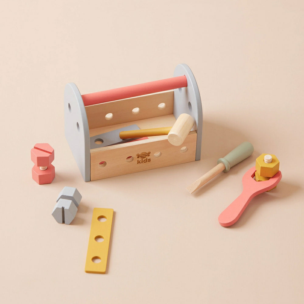 Inspire your mini maker with this adorable wooden pastel toolbox set, designed for curious toddlers who love to build, fix, and play pretend. Beautifully crafted from smooth, natural wood and painted in soft pastel tones, this 14-piece set includes a hammer, wrench, screwdriver, nuts, bolts, wooden planks, and a sturdy toolbox for tidy storage. Perfectly sized for little hands, each tool helps develop fine motor skills, hand-eye coordination, and problem-solving abilities through creative, open-ended play. Children can twist, hammer, and assemble to their heart’s content—building confidence as they explore how things work in their very own workshop.