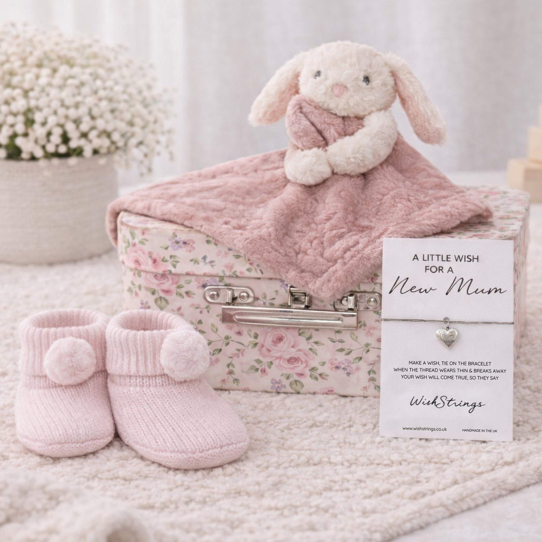 Welcome a precious little one with this beautifully curated baby girl gift set, thoughtfully presented in a charming floral keepsake suitcase. Inside you’ll find a super-soft pink bunny comforter, cosy knitted pink baby booties with delicate pom-pom detail, and a heartfelt “New Mum” wish string bracelet. The vintage-style floral case adds an extra special touch, making this a stunning and sentimental gift.
