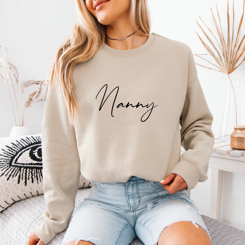 Get cozy and show your love for nannies with our Nanny Script Sweatshirt! Made with soft and durable fabric, this sweatshirt features a bold "Nanny" script design. Perfect for snuggling on the couch or running errands, this sweatshirt is a must-have for any nanny.