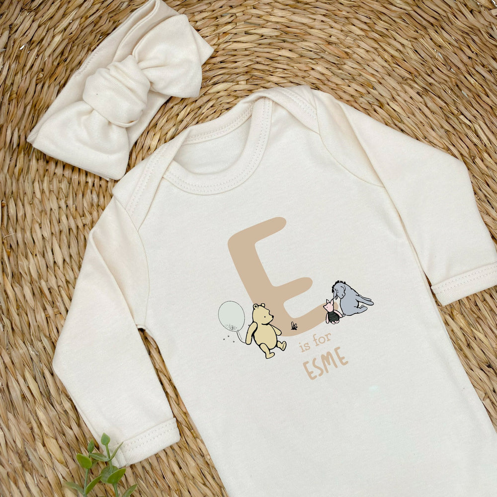 Wrap your little one in comfort with this Personalised Beige Pooh Bear Initial Babygrow. Crafted from soft, gentle fabric, it keeps your baby cozy while featuring a charming Pooh Bear design. Personalised with your chosen initial, it adds a special touch that makes it a perfect keepsake or gift. Ideal for everyday wear, this babygrow supports your baby's comfort and style from day one.