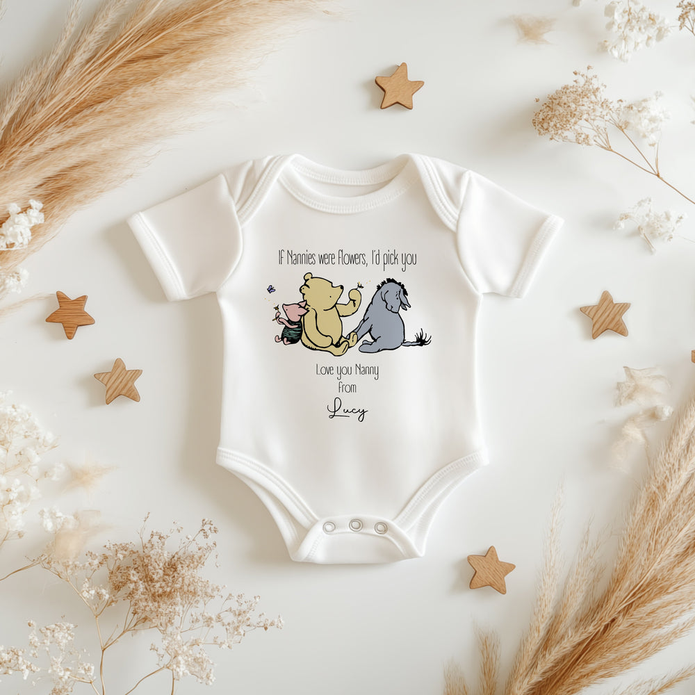 Celebrate the special bond with a nanny through this charming babygrow or vest featuring a classic Pooh Bear design. Personalised with the heartfelt message "If Nannies Were Flowers I'd Pick You," it’s a thoughtful gift that shows appreciation and love. Made for comfort and cuteness, this outfit is perfect for little ones to wear while reminding nannies how truly cherished they are.