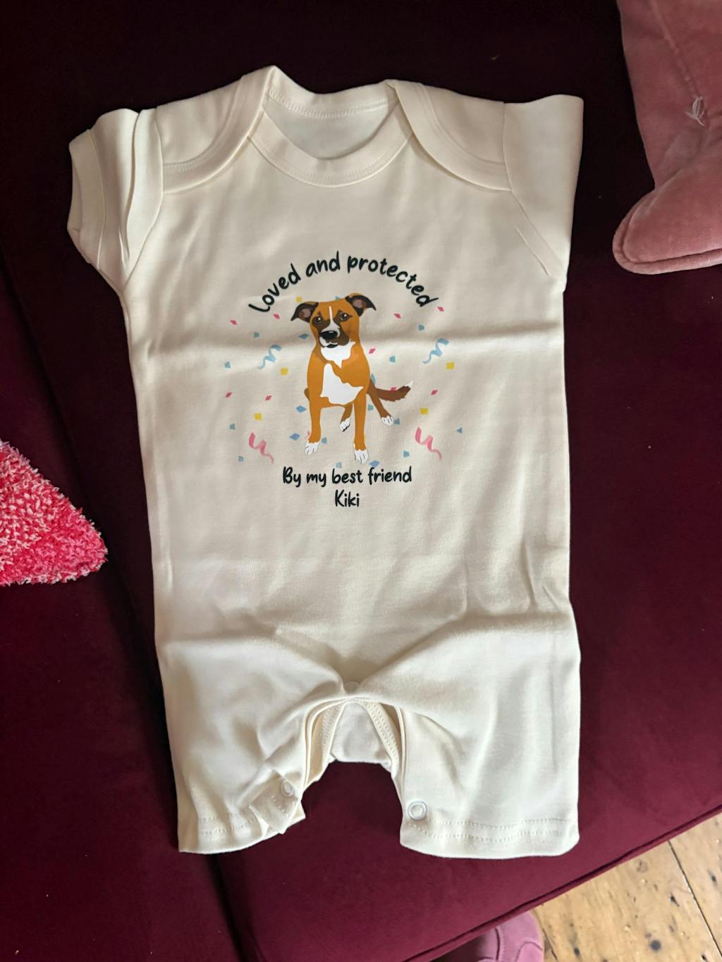 Wrap your little one in love and protection with our Personalised Loved and Protected By Dogs Romper. With 140 adorable dog graphics to choose from, this romper is sure to be a hit with both parents and babies alike. Show off your fur-baby pride and give your little one a unique and special romper today!