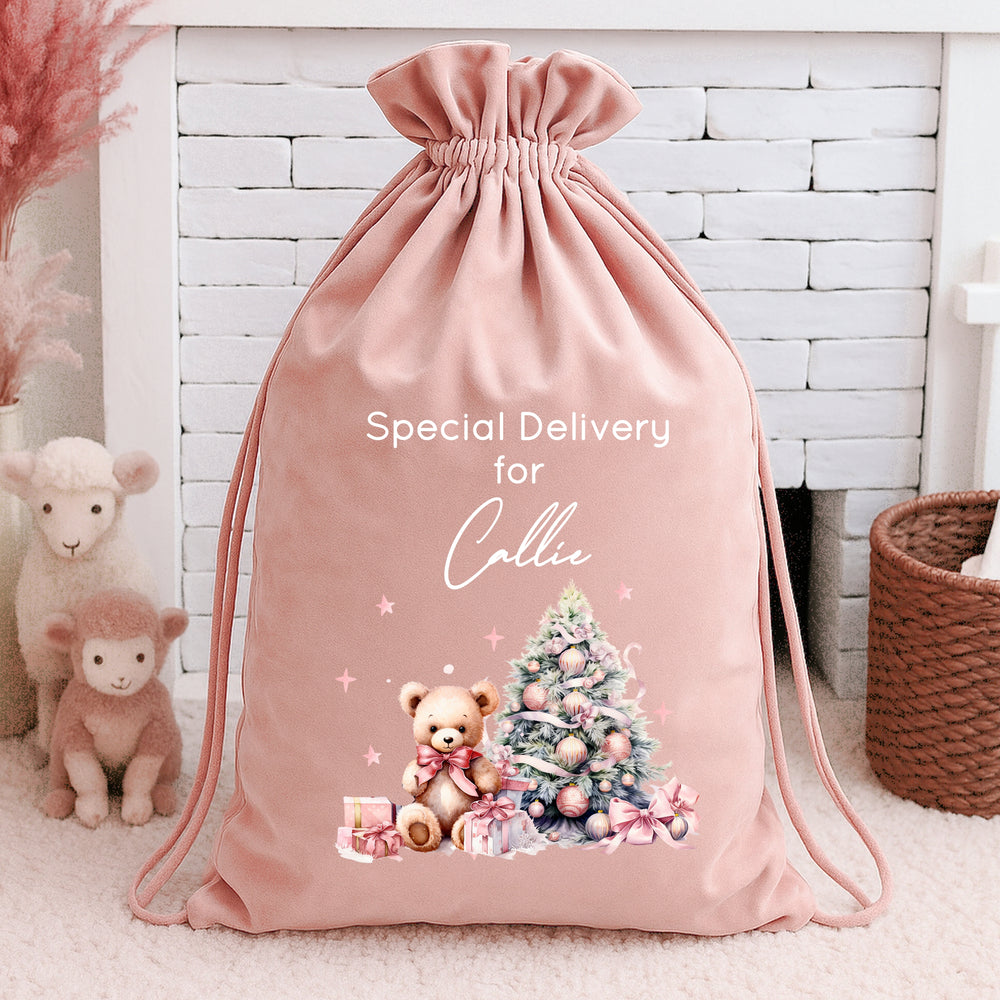 Personalised Pink Teddy Christmas Tree Pink Santa Sack or Stocking