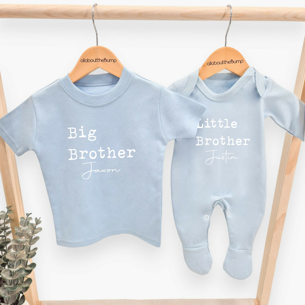 Create a special bond between siblings with our personalised matching blue babygrow/t-shirt! The perfect way to celebrate and cherish the arrival of a new family member. Personalise each piece with their names for a unique and thoughtful gift. Made from soft, high-quality fabric for the utmost comfort and style.